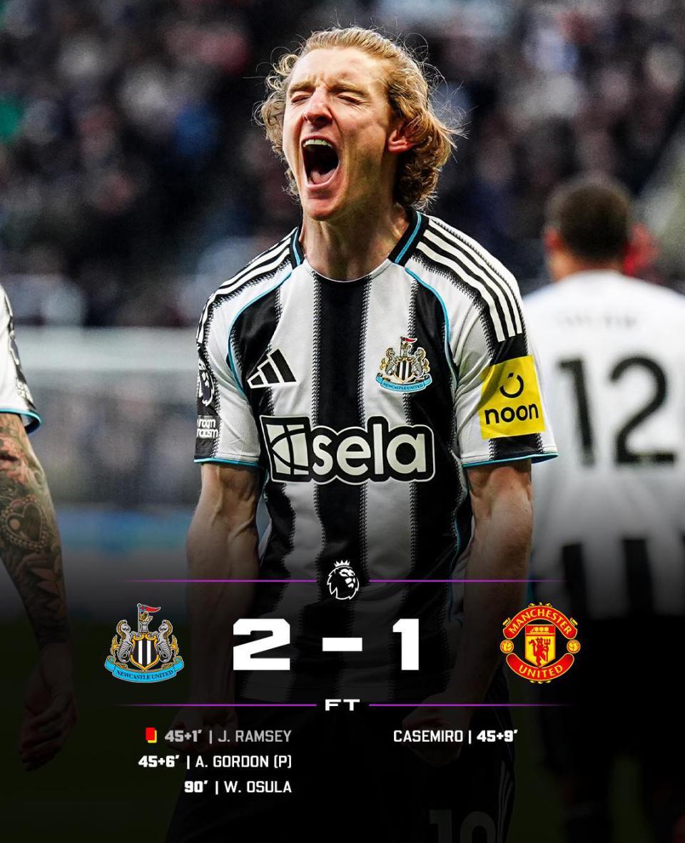 英超第29轮,状态火热的曼联做客挑战近期低迷的纽卡斯尔联,在长时间多打一人的情况下,竟然在第90分钟惨遭绝杀,1-2饮恨圣詹姆斯公园。